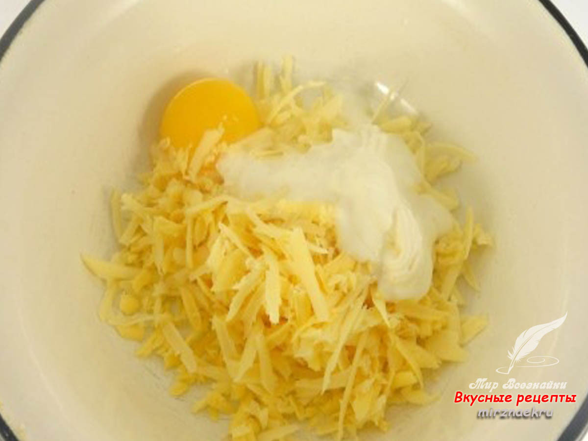 Сыр натереть на крупной терке, добавить сметану и яйцо. Хорошенько перемешать.