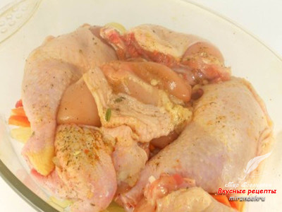 Куриные окорочка посолить, поперчить, посыпать специями. Хорошо перемешать и оставить на 15-20 минут.