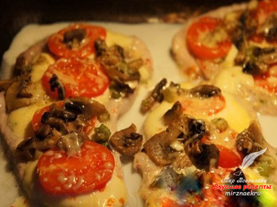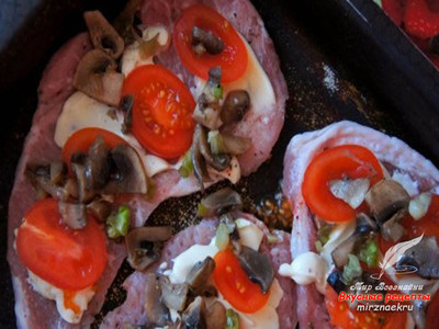 Очень вкусная свинина, запеченная с грибами и помидорами, готова.