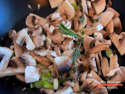 Грибы нарезать произвольным образом, добавить соль, перец, веточки розмарина, тимьяна. Обжарить грибы с добавлением небольшого количества растительного масла в течение 2-3 минут.