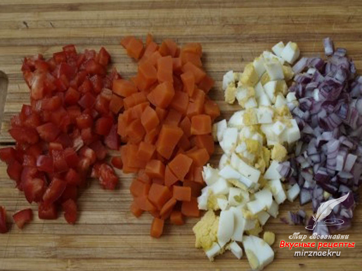 Сельдь разделяем на 2 филе, удалив хребет и косточки. Режем некрупными кубиками болгарский перец, морковку, яйцо, красный лук, измельчаем зелень.
