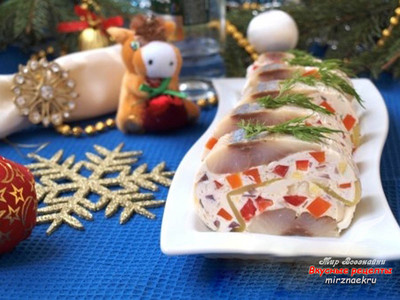 Нарезаем закуску острым ножом и подаём к столу. В разрезе фаршированная сельдь выглядит очень эффектно.